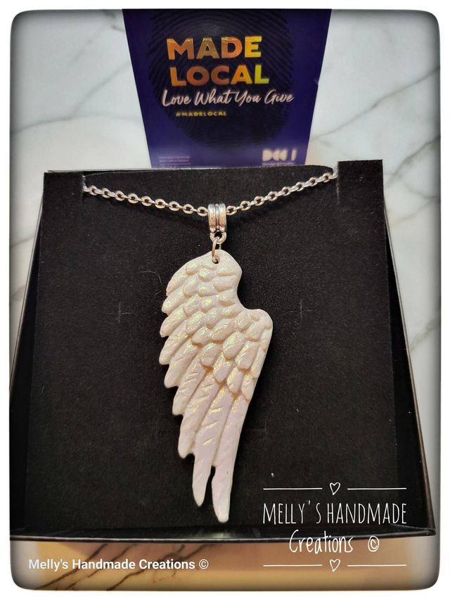 Gorgeous angel wing handmade from polymer clay and mounted on a silver chain. It features a heart clasp.
