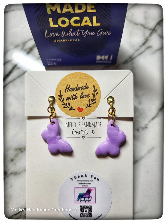 Cute lilac shimmery butterflies mounted onto clip-on earrings.