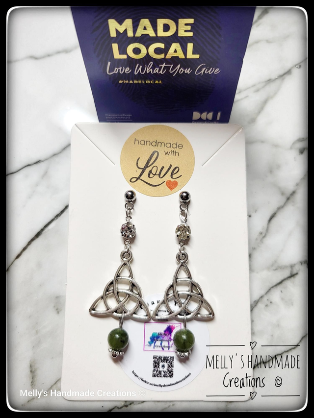 Celtic Trinity Knot earrings with Jade and Cubic Zirconia stones.