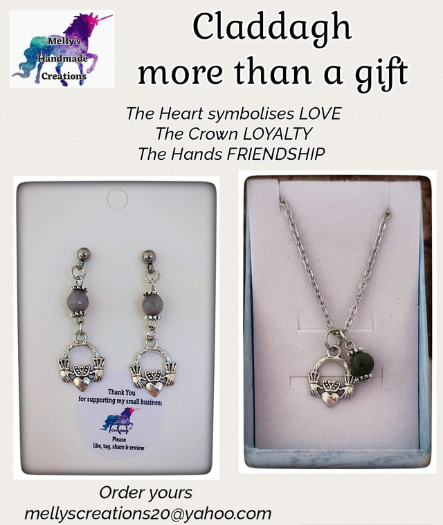 It represents Love, Loyalty and Friendship. The Heart is Love The Crown is Loyalty The Hands are Friendship They feature semi previous gemstone beads.