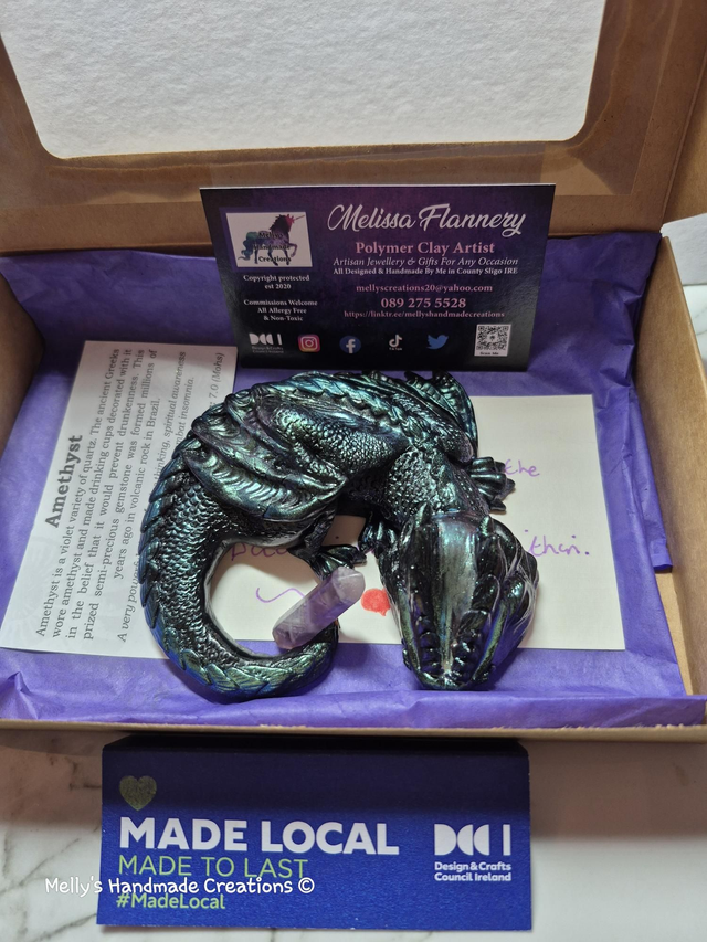 Each Dragon comes with details about your crystal, a handwritten affirmation card, as well as in a windowed gift box.