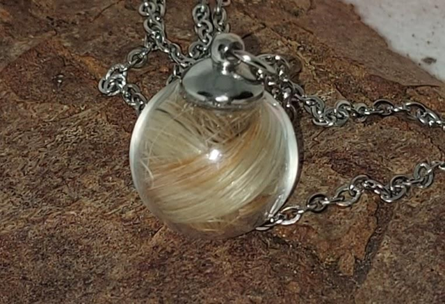 Have your pet's hair forever with you in a delicate glass globe mounted onto a silver chain.
